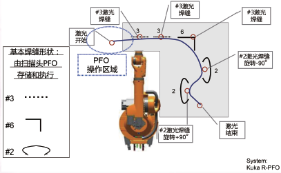 除了激光拼焊,激光飛行焊也已經(jīng)被廣泛應(yīng)用于汽車(chē)車(chē)身及其他零部件的焊接。激光飛行焊是將振鏡焊接頭與機(jī)器人的運(yùn)動(dòng)結(jié)合起來(lái),實(shí)現(xiàn)高效靈活的激光焊接。振鏡(PFO)及飛行焊的原理見(jiàn)圖4、5、6。其中PFO可以通過(guò)兩片鏡片的旋轉(zhuǎn),實(shí)現(xiàn)激光焦點(diǎn)在工件上的快速靈活移動(dòng)和定位,可以大大提供激光焊接時(shí)的動(dòng)態(tài)性能,更加高效。而機(jī)器人則可以擴(kuò)展焊接范圍,以實(shí)現(xiàn)更大零件的焊接。兩者的結(jié)合,則可以實(shí)現(xiàn)優(yōu)勢(shì)互補(bǔ),達(dá)到高效、靈活、低成本的激光焊接。