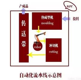 先介紹一下整條自動化生產線完工后的狀況吧,有視頻為證,A集團現在量常較大的一種隔音棉(用于汽車發動機等隔音),工人將一張完整的料(毛胚棉)放入工作臺,經過熱成型機(德國人叫moulding),再由工業機器人將其從高溫高壓的熱成型機中取出,置入沖切機(德國人叫cutting),一張料可以切割生產出兩件成品,工業機器人(robot)再將切割好的成品取出,置入機器邊的傳送帶,進行產品輸出下線。