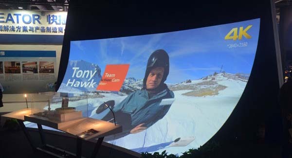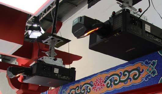 日立的影壁投影展示區采用1DLP高亮度激光工程機(TCP-BL7500U)2臺及超短鏡頭(FL-920)背投,結合邊緣融合技術,給參觀者中國風的體驗。這個顯示系統簡單,特別適用于空間狹小,投射距離有限的展示區域。此類的方案非常之多,在新光源的條件下,方案形式更多樣化,曲面、融合、異形,球面等形式成為了可能。