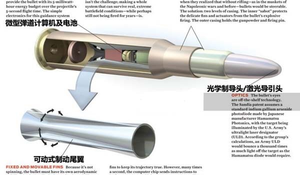 圖為”精確制導子彈“的實際剖面截圖,可見與傳統子彈的結構截然不同,可見微型彈道計算機和傳感器。