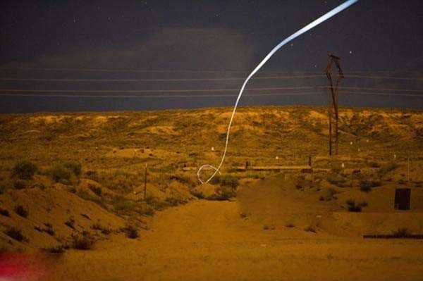 制導子彈的傳動系統包括一個驅動電機和一個形似魚鰭的微型可控彈尾。驅動電機可為傳統系統提供動力,微型尾翼可不斷調整彈道,使子彈以曲線彈道擊中目標(即使目標躲在墻后也可打中)。圖為美軍在桑迪亞國家試驗室進行制導子彈試射時的延遲攝影圖,圖中看到的彈道實際是制導子彈尾部的LED指示燈留下的,可以清晰看到其在飛行中可多次改變彈道直至命中目標。