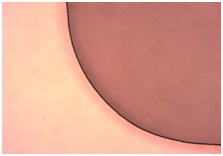 上圖為玻璃在400倍顯微鏡下的切割工藝圖,崩邊尺寸小于3微米,側壁光滑。