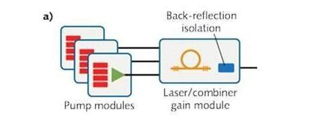 圖2:6kW的Lumentum光纖激光器包含三個2kW的模塊和一個光纖合束器模塊(a)。該光纖激光器由該公司的ST系列高亮度光纖耦合激光二極管泵浦(b)。