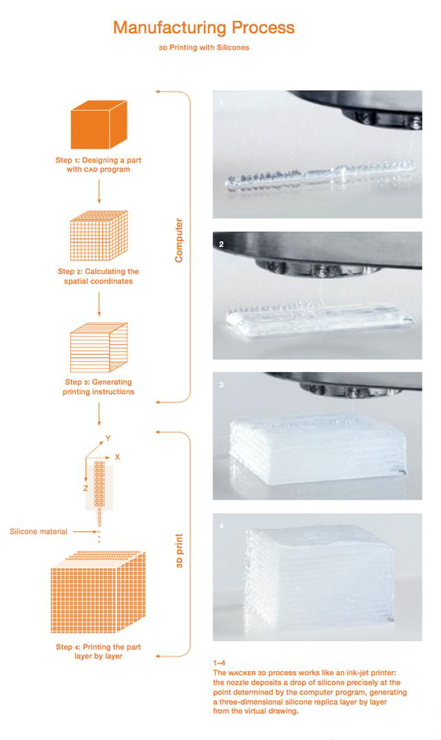 瓦克化學(WackerChemie)成立了瓦克有機硅事業部WACKER SILICONES作為其硅膠生產的分支,并與德國產品開發公司Enders Ingenieure GmbH合作研發一種紫外光固化打印方法,可以把硅膠作為3D打印材料。因為硅膠是透明的,所以瓦克公司開發的這種特制硅膠也可以用于光學應用,例如3D打印定制隱形眼鏡。