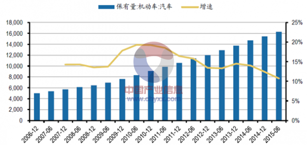 2015年我國汽車行業保有量及其增速走勢圖(萬輛)