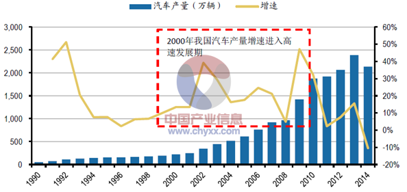 2015年我國汽車產量及其增速走勢圖(萬輛)
