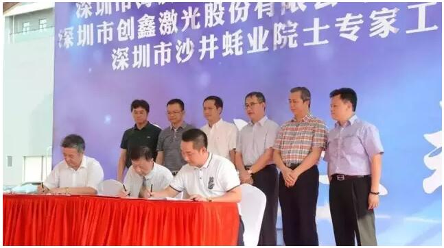中國科學院院士林尊琪、寶安區區長姚任、深圳市法制辦主任胡建農、沙井街道辦書記趙俊平、創鑫激光董事長蔣峰、院士專家服務中心理事長趙近元,有關部門領導、企業代表100余人出席工作站成立儀式。林尊琪、蔣峰、趙近元三方代表共同簽署建立深圳市創鑫激光股份有限公司院士專家工作站協議書。