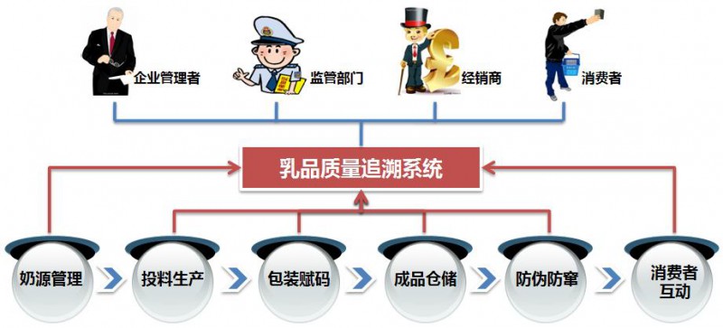 通過立德激光打碼創新技術與二維碼結合,建立乳品安全電子信息追溯系統,實現乳制品行業生產銷售過程進行全程的質量監控和追蹤。從奶源、運輸、加工、配送、銷售到消費者手中,實現奶粉追溯中各環節系統之間的信息采集、從而做到全程信息的全面化、一體化和可視化,實現原料、成品、供應商等基礎數據,庫存狀況,經營數據集成,實現信息共享和高效協同運作,達到對奶粉的及時有效跟蹤與追溯。