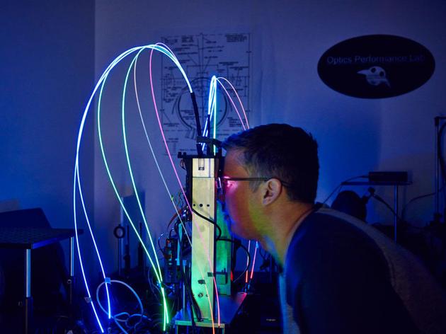 從今年4月《連線》雜志一張秘密訪問Magic Leap的照片可以看出,這家公司的AR眼鏡需要由光纖把多種顏色激光器發(fā)出的光導入到鏡片中,看起來相當酷炫。