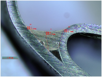 激光焊相關氣孔標準,見表1,參見13919-1、ISO 5620等。企業對焊縫氣孔數量有大小有嚴格的限制。針對內部氣孔,最大直徑為0.5mm,針對外部氣孔,根據要求為0.2mm,不影響后續油漆噴漆即可。另外,從金相上來看,氣孔主要集中在焊縫的底部。