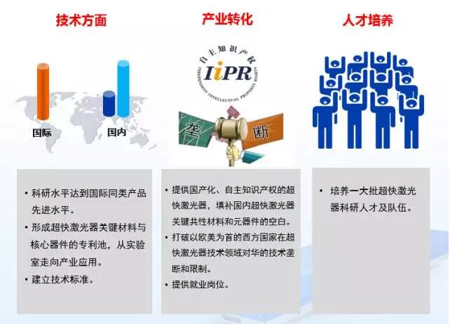 該項目完成后,將實現皮秒/飛秒激光器的自主研發和產業化,科研水平達到國際同類產品先進水平,形成超快激光器關鍵材料與核心器件的專利池,讓產品從實驗室走向產業應用,建立技術標準。