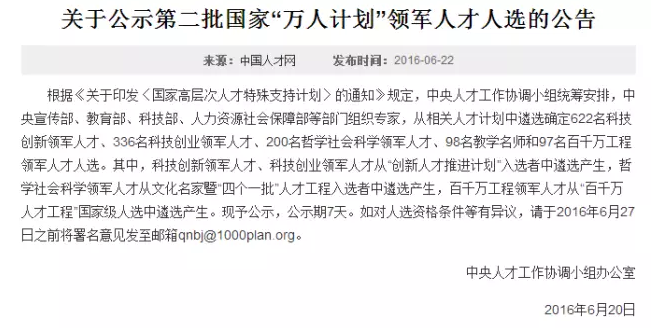 萬人計劃”又稱“國家高層次人才特殊支持計劃”,2012年經黨中央、國務院批準,中央組織部、人力資源社會保障部等11個部委聯合組織實施的國內高層次人才支持計劃。 “萬人計劃”定位高端人才,入選者均代表國家科技創新重點領域、行業學科一流水平的高層次人才。“萬人計劃”將用10年時間重點遴選國內杰出人才、領軍人才、青年拔尖人才10000名。
