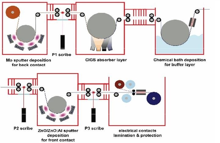 采用PI柔性襯底,可利用卷繞技術(Roll-to-Roll生產工藝),將材料折疊成卷,可大規模制造質量輕、可彎曲的電池,相對于傳統的剛性襯底(玻璃等)薄膜電池,可大大提高生產效率,流水線生產過程如圖2.3所示所示: