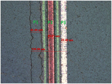 P2制程時,波長532nm,激光能量5μJ,重復頻率500kHz,振鏡掃描速度250mm/s,聚焦鏡焦距250mm;