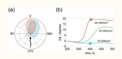 科學家們對光的散射機理的數值模擬如圖2(b)。仿真結果表明,當納米天線由微弱的激光束進行照射時,光會散射到天線一側。然而,當用強激光脈沖進行照射納米天線時,會導致裝置內的電子等離子體的散射圖案旋轉20度(紅色線)。這就提供了一個實現入射脈沖在不同方向偏轉弱或強的方法。