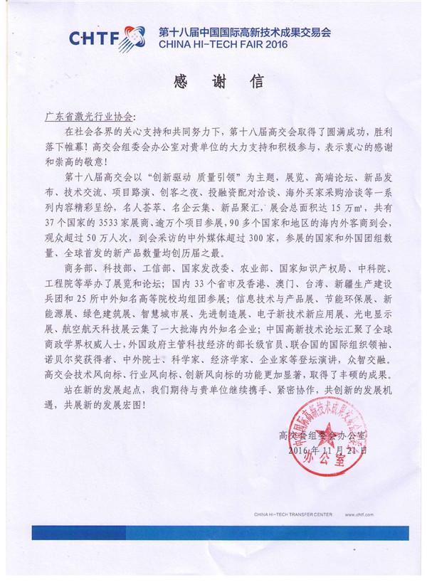 在剛剛結束的高交會上,廣東省激光行業協會榮譽收到中國國際高新技術成果交易會組委會頒發的“優秀組織獎”并附感謝信,感謝信說:“在社會各界的關心支持和共同努力下,十八屆中國國際高新技術成果交易會取得了圓滿成功,勝利落下帷幕。高交會組委會辦室對貴單位的大力支持和積極參與,表示衷心感謝和崇高的敬意”! “并期待與貴單位繼續攜手,緊密協作,共創新的發展機遇,共展新的發展宏圖”。