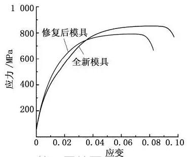 圖3為常溫下修復后模具與全新模具的拉伸應力-應變曲線??梢钥闯觯煸嚇拥淖冃坞S著拉伸應力的增加而增加,但并不成線性關(guān)系;當拉伸應力在690MPa以下時,A-MAX鋼的應變較為明顯,當拉伸應力在750MPa以上變化時拉伸應力與應變呈近似線性關(guān)系。
