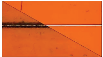 圖1:CO2激光(左)與 UV 激光(右)的切割槽比較。UV 激光產生熱效應較小,其切割邊沿干凈、整齊。