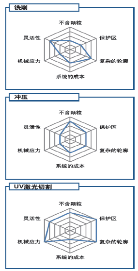 SMT后分板即切割多種電子元器件已被裝配的電路板,該工序已經處在生產鏈的末端。對于分板,可選擇不同的技術:對于通常用的PCB,優先考慮使用傳統的刀切、沖壓和輪廓銑削等工藝。對于較為復雜的電子線路以及薄型基板尤其是對機械應力、粉塵和尺寸偏差非常敏感的情況,則采用UV激光切割分板更有優勢。以下三個圖表從不同因素對這三種方法進行了評估。