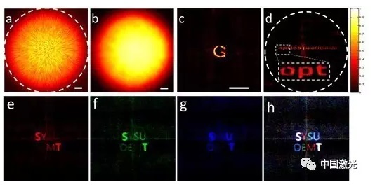 圖   散射體透視成像  a, b)透過散射體,相機拍攝到的彌散光斑; c, d)通過算法從彌散光斑中恢復出來的隱藏物體圖像; e-h) 恢復隱藏物體的彩色圖像。