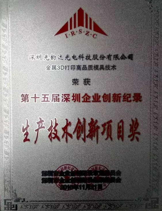 新紀錄項目內容:深圳光韻達光電科技股份有限公司于2016年成功推出金屬3D打印高品質模具技術。從設計上來看,隨形冷卻流道的根本原則是隨著產品輪廓的變化而變化,因此設計的自由度被大大提高;從制造上來講,由于采用了金屬3D打印技術,才使得隨形冷卻設計成為可能。本項目將極大地推動該技術的產業化應用,為模具行業的技術升級提供動力。