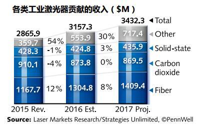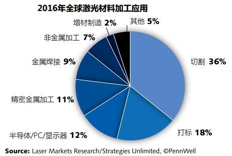 汽車、航空航天、能源、電子和通信(智能手機(jī))材料加工應(yīng)用,繼續(xù)推動(dòng)工業(yè)激光器銷售額的強(qiáng)勁增長。在三大主要工業(yè)激光器應(yīng)用類別(微加工、宏觀加工、打標(biāo))中,微加工應(yīng)用(包括使用功率 <500W 激光器的所有應(yīng)用)占據(jù)了工業(yè)激光器市場總額的 35%,增長率達(dá)到了 105%,這包括需要準(zhǔn)分子激光器的顯示應(yīng)用——相干表示,在其截至 2016 年 7 月 2 日結(jié)束的第三財(cái)季,“正如同預(yù)期的那樣,我們收到了大量來自平板顯示器退火應(yīng)用領(lǐng)域的激光器訂單,其中有單個(gè)訂單額就超過 1 億美元。”宏觀加工應(yīng)用(包括所有需要 >500W 功率的激光加工)在工業(yè)激光器收入中占據(jù)最大的市場份額(47%),這要感謝光纖激光器,其拿下了宏觀應(yīng)用市場中 44%的份額。最后,打標(biāo)應(yīng)用(包括雕刻)貢獻(xiàn)了約 18% 的工業(yè)激光器收入,保持了 3.9%的穩(wěn)定增長,這部分市場主要由光纖激光器主導(dǎo),占打標(biāo)領(lǐng)域總銷售額的 49%。切割是兩個(gè)層面上最重要的應(yīng)用 :一是產(chǎn)生的收入,二是對高功率光纖激光器的使用。切割對于工業(yè)化國家和新興經(jīng)濟(jì)體都非常關(guān)鍵,其增長前景與一個(gè)國家的 GDP密切相關(guān)。隨著 2016 年經(jīng)濟(jì)的疲軟,切割市場的增長率只有 3.5%。奇怪的是,由全球汽車工業(yè)和管道及井下油管焊接推動(dòng)的激光焊接需求(3.4%),彌補(bǔ)了切割市場的不景氣。纖維增強(qiáng)聚合物中的非金屬加工應(yīng)用與精細(xì)金屬加工加在一起,為總的市場增長貢獻(xiàn) 了 5%的力量。增材制造(更具體地說是激光金屬沉積)在 2016 年強(qiáng)勁增長了 22.1%,增長的主要原因是這種制造方式獲得了航空發(fā)動(dòng)機(jī)行業(yè)的認(rèn)可,增材制造中使用的多是中高功率 CO2激光器和光纖激光器。