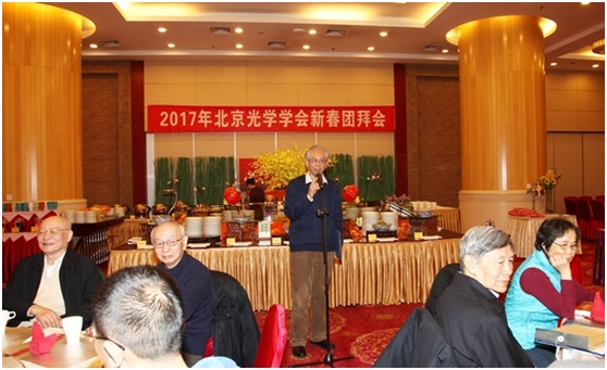 新春團拜會由學會秘書長劉寶勝主持。在熱烈的掌聲中,北京光學學會理事長許祖彥院士致新年賀詞。許祖彥院士說,“各位市科協領導,各位院士及家人,各位老中青科技工作者,以及所有關心、支持北京光學學會的朋友們,大家上午好!在2017年到來之際,我代表北京光學學會,向出席團拜會的各位朋友們致以新春的祝福!向金國藩先生和周立偉先生兩位學會名譽理事長致以崇高的敬意!”