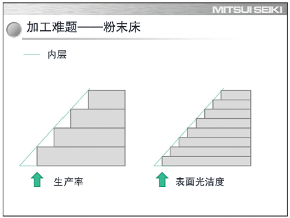 要達到減材制造的速度需要權衡三維中每一層的厚度。你可以用更高的能量輸入或是生成更厚的粉末層或是更快的成型以提高生產率,但表面光潔度會受影響。或者你可以接受一個緩慢的過程,來形成較小的層,獲得更好的表面光潔度。