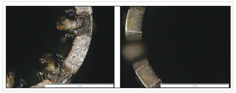 圖四:超快激光切割細(xì)304 不銹鋼管。圖左為管子方形槽全貌,圖右為管子對面內(nèi)壁。