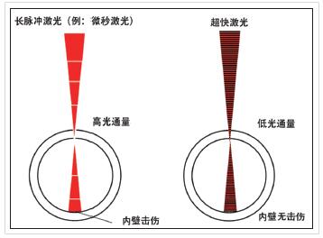 光纖激光的另一個(gè)局限是容易擊傷內(nèi)壁。由于光纖激光需要高功率才足以切穿管壁,使光能持續(xù)前進(jìn),到達(dá)管子對面的內(nèi)壁。即便激光已經(jīng)發(fā)散,光纖激光的高光通量仍然高過材料的損傷閾值,足以擊傷內(nèi)壁。被擊傷的內(nèi)壁不但會降低機(jī)械性能,也會弱化支架抗腐蝕的性能。超快激光需要的功率小,當(dāng)激光切穿管壁后再經(jīng)發(fā)散達(dá)到對面的內(nèi)壁時(shí),其光通量已不足擊傷內(nèi)壁,因此不會降低支架性能。