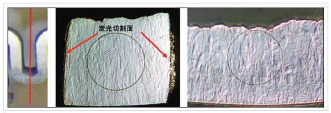圖四為超快激光在304 不銹鋼管上切割方形槽。圖左顯示,加工區(qū)域的周邊沒有熱效應(yīng),切割邊緣沒有熔渣和毛刺。圖右的顯微鏡照片聚焦在管子對面的內(nèi)壁,內(nèi)壁表面干凈連續(xù),沒有擊傷。