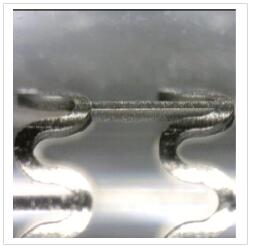 利用金相顯微鏡從支架截面觀察金相,可以看出熱效應(yīng)是否存在,熱效應(yīng)會改變金屬晶粒的大小,因此若熱效應(yīng)存在,則位于切割邊緣附近的晶粒大小會與本體的晶粒不同。圖五為一超快激光切割的316L 不銹鋼支架。如圖左的紅線所示,金相觀察的截面為支架的彎角,該處圖形最復(fù)雜,為熱最不易散去的地方。圖中為支架截面的金相,圖右則是作為對照觀察的未加工過的316L 不銹鋼管。晶相從支架與對照的比較看不出差異,且支架的晶相連續(xù),切割邊緣無不同的晶相存在,表示以超快激光切割的該支架不存在熱效應(yīng)。圖四為支架的局部照片。