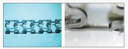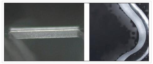 圖十:超快激光切割聚乳酸類支架。圖左為聚乳酸,圖右為聚L- 乳酸。圖十是超快激光切割的聚乳酸類高分子可降解支架。從圖可見,切割面是完整連續(xù)的毛砂面,沒有毛刺,無明顯的熱效應(yīng)。