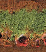 圖4顯示的是磷青銅與不銹鋼焊接的掃描電子顯微鏡(SEM)成像。在這個實(shí)驗(yàn)中,針對磷青銅一側(cè)的焊接界面進(jìn)行過失效測試,結(jié)果發(fā)現(xiàn),富含鐵(圖中綠色部分)的焊接基材熔入韌性剪切帶失效的磷青銅并被包圍。
