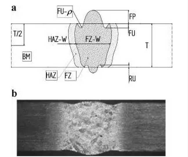 圖2.1 (a)焊縫典型的橫截面示意圖。FU:表面填充,RU:根部填充,FU-ρ:表面填充半徑,FZ-W:熔融區寬度,HAZ-W:熱影響區寬度;(b)典型橫截面的宏觀圖(1.2kW,42mm / s的焊縫)