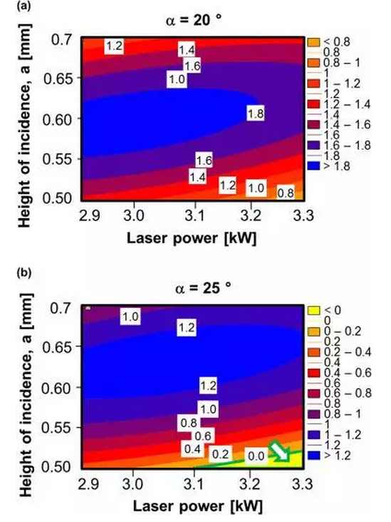 Nikolai Kashaev等人對Ti-6Al-4V對接接頭和T接頭進行Nd:YAG單面激光焊接工藝進行了研究,使用合金兼容的填充焊絲來避免底部填充和咬邊。他們使用二次回歸建立了“非焊接皮”寬度與激光功率、入射角和入射高度的關系,通過合理的參數優化,獲得了具有低孔隙率和適當幾何形狀的焊縫。優化結果如圖2.2所示。