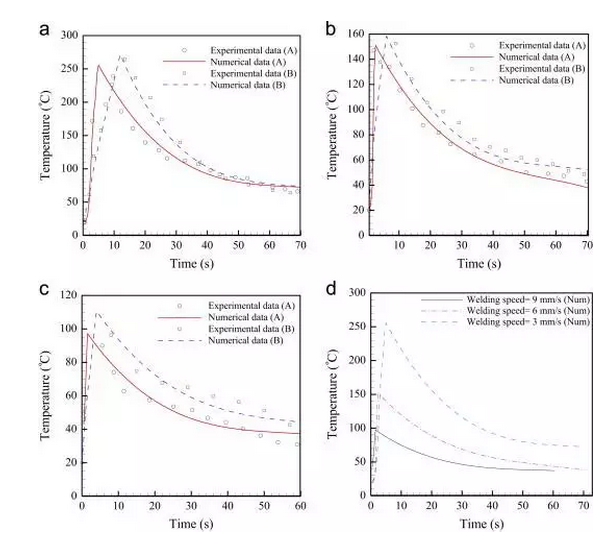 Akbari M[17]等人進行了激光焊接鈦合金(Ti6Al4V)的數值和實驗研究,模擬了溫度分布,熱影響區(HAZ),熔池的深度和寬度。研究發現,在恒定的焊接速度下,不同焊接速度的溫度歷史有相似的趨勢。降低焊接速度,溫度圖的峰值增加,并且其最大值出現在較長時間(圖2.3)。
