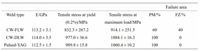 研究表明Nd:YAG激光器加工后的焊接質量高于用光纖激光器或二極管激光器產生的焊縫。三種焊接類型的硬度值非常相似。但是強度和塑性不同,這主要是受到不同類型孔的焊接缺陷的影響。三種焊接形式的力學性能如表4.2所示。