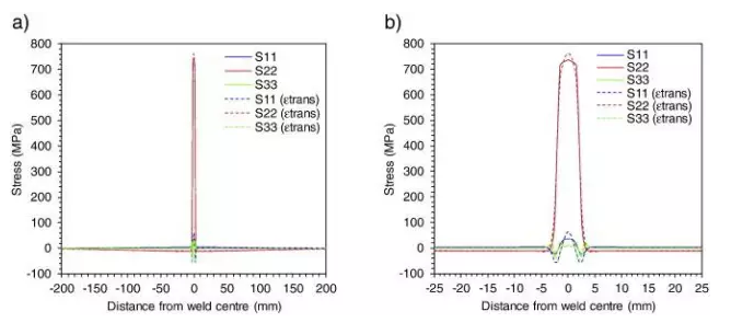 圖5.4 殘余應力分布:(a)在所有三個主要方向上,在焊縫附近的整個寬度上,(b)橫向(11),縱向(22)和具有及不具有相變的法線方向