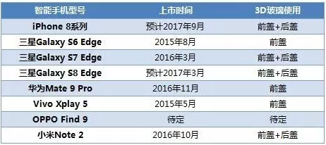 智能手機(jī)兩大陣營(yíng)中,安卓系的三星、華為、Vivo、OPPO、小米等都已經(jīng)推出3D 玻璃蓋板的手機(jī)型號(hào)。市場(chǎng)預(yù)計(jì)蘋(píng)果將為iPhone8配備3D玻璃蓋板與后蓋。