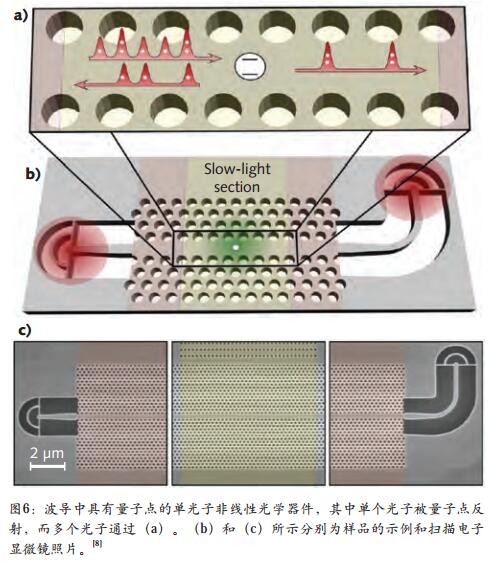 例如,通過將量子點集成到光子晶體波導中,丹麥哥本哈根 Niels BohrInstitute 的研究人員能夠證實單光子水平的非線性光學元件——單個光子被量子點反射,而多光子將通過(見圖6)。光子間的這種非線性相互作用,使得經典和量子信息技術的邏輯運算成為可能,為可擴展的基于波導的光子學量子計算架構鋪平了道路。