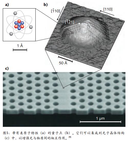 半導體量子點在三維尺寸上具有納米尺寸,使得它們的電子狀態由于緊約束而被量化。這些量子點也顯示出其他的類單原子特性,如較強的光子反聚束和近壽命極限的線寬,通常被稱為人造原子。它們是有趣的系統,可用于實現量子位,并且由于半導體加工已被很好地理解,半導體量子點是可擴展量子計算機尤為有希望的候選者。與實際原子不同,半導體量子點可以以固態的方式生長,像光子晶體腔和波導等其他結構可以在其周圍構建(見圖 5)。