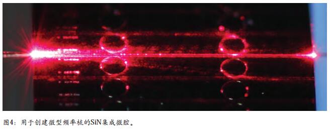 所得到的頻率梳的性質,在很大程度上取決于泵浦激光波長,因為CW 激光器可以激發非相干高噪聲狀態以及孤子態。孤子態是有利的,因為所得到的頻率梳是相干的并且具有極低噪聲、窄線寬和短脈沖。如果從較高頻率到較低頻率掃描泵浦激光器,將發生不同孤子態間的急變階段。每個階段對應于在微諧振器中循環的孤子數量的連續減少。通過反饋至激光器,可以在其中一個階段穩定微型梳,從而允許穩定的孤子操作。圖 3所示為由可調諧二極管激光器泵浦氮化硅(SiN ;見圖 4)制成的這種微腔的光學單孤子光譜。