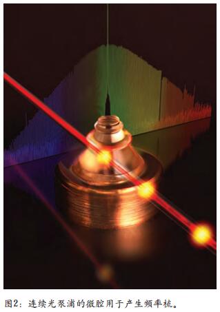 微諧振器也越來越多地被用于產生光學頻率梳。由于導引光場的小模式體積和高達 1010 的高 Q 因子,這些諧振器的強度變得非常高,使得非線性效應變得非常強烈。微諧振器可以通過非線性四波混頻將 CW 激發光轉換成其他頻率分量,從而產生頻率梳(見圖 2)。