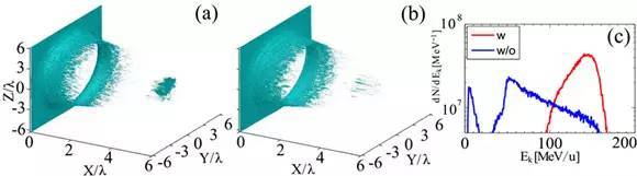 圖2 三維粒子模擬結果。考慮電離(a)與不考慮電離(b)情況下,在激光作用結束時,Al13+離子密度等值面分布圖;(c)相應Al13+離子能譜(紅線代表考慮電離的情形,藍線表示不考慮電離的情形)。