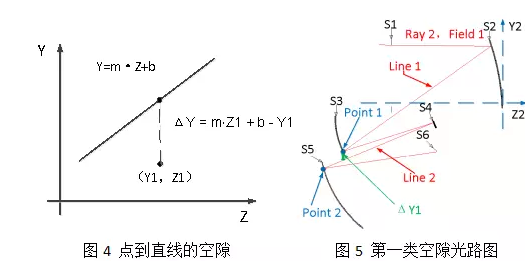 圖2中序號1所指示的空隙可按照圖5所示的光路進行計算。對視場F1的子午上邊緣光線R2進行光線追跡,光線在表面S3上的交點為點1(Point 1),經表面S4反射后的光線為直線2(Line 2)。點1到直線2在Y向的距離就是空隙ΔY1。