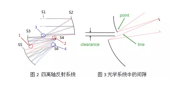 如圖2所示,在一個四離軸反射系統中,按照遮擋光線對視場和通光孔徑產生的影響分成兩類空隙。第一類,在該區域如果發生光線遮擋將會影響通光孔徑,產生漸暈,如圖2中序號1和2所指示的空隙;第二類,在該區域的光線產生會聚,如果發生光線的遮擋將會影響系統的視場,如圖2中序號3和4所指示的空隙。