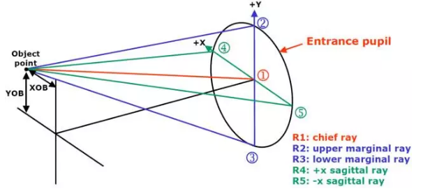 在光學設計軟件CODE V中,進行光線追跡時,對光束定義了5種參考光線,R1中心光線、R2子午上邊緣光線、R3子午下邊緣光線、R4弧矢邊緣光線(+x)、R5弧矢邊緣光線(-x),如圖1所示。通過計算這五種參考光線的軌跡,可以比較全面地反映光學系統的結構參數