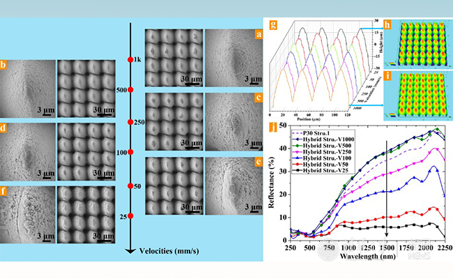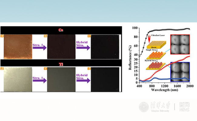 該成果提出了一種基于超快激光脈沖注入調(diào)控的金屬表面微米-納米雙尺度復(fù)合結(jié)構(gòu)雙級調(diào)控制備新方法,通過對超快激光加工過程中脈沖注入數(shù)量和注入方式的靈巧控制,實現(xiàn)了對微米尺度結(jié)構(gòu)和納米尺度結(jié)構(gòu)的分別有效調(diào)控,從而可以同時發(fā)揮微米尺度結(jié)構(gòu)的幾何陷光效應(yīng)和納米尺度結(jié)構(gòu)的等效介質(zhì)效應(yīng),最終達到優(yōu)異的高效抗反射性能。這是利用超快激光在可控微納米制備方面取得的最新研究進展。該方法對于銅(Cu)、鈦(Ti)、鎢(W)等多種金屬均有效,可在其表面分別獲得1.4%,0.29%,2.5%的已知最低金屬表面反射率,是一種在金屬表面可控構(gòu)建微納米復(fù)合功能結(jié)構(gòu)的通用方法。