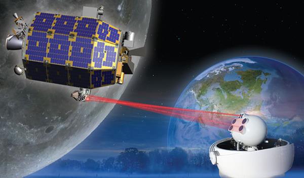 激光望遠(yuǎn)鏡系統(tǒng)的原理如下:四架地面望遠(yuǎn)鏡把經(jīng)過(guò)編碼的紅外脈沖發(fā)射到太空中,然后被安裝在繞月球運(yùn)轉(zhuǎn)的衛(wèi)星上的望遠(yuǎn)鏡捕獲。地球大氣會(huì)輕微地干擾脈沖信號(hào),這就是為什么需要發(fā)射四個(gè)同步的脈沖信號(hào),這能使連接保持穩(wěn)定和完整。隨后,衛(wèi)星上的望遠(yuǎn)鏡把紅外光束聚焦到光纖上,光纖中的光檢器把光的閃爍解釋為電脈沖,然后再將其轉(zhuǎn)換成數(shù)據(jù)資料。